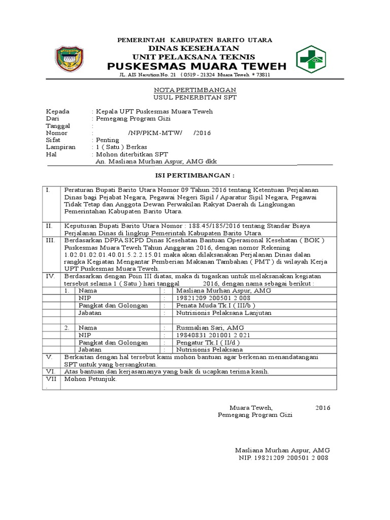 Mohon diterbitkan SPT untuk kegiatan Imunisasi Rutin Di Desa Pandran JariPayang Ara dan Tapen Raya Oleh Tenaga Kesehatan Puskesmas Kandui an TARSIANI Amd Keb. Dalam pengajuan resign pun ada aturan yang berlaku pada setiap perusahaan.