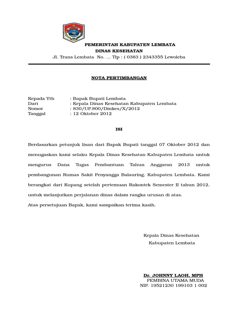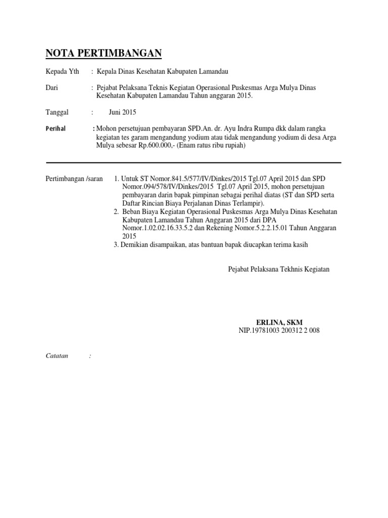 Sebagai bahan pertimbangan Bapak turut saya lampirkan kelengkapan administrasi sebagai berikut. Berdasarkan informasi yang kami dapat dari penjelasan Badan Tata Naskah Dinas Lembaga Sandi Negara nota dinas merupakan sebuah naskah dinas yang dibuat oleh seorang pejabat yang. Nomor nota berisi nomor nota kode jabatan penandatangan kode klasifikasi arsip bulan serta tahun.