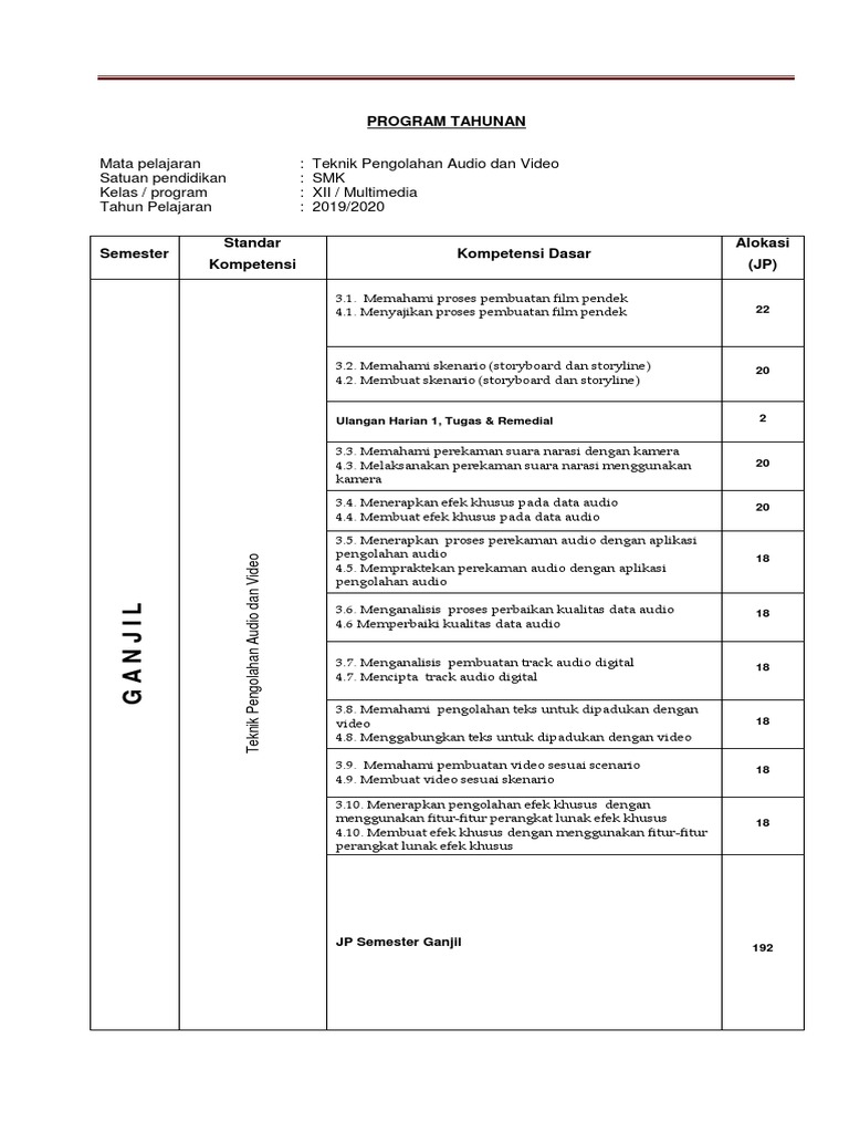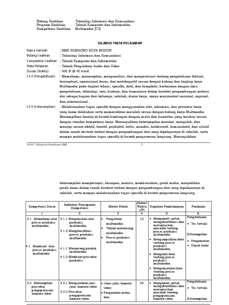 Silabus teknik pengolahan audio video k13 18 kompetensi dasar keterampilan dan pengetahuan 408 jam pembelajaran. Selamat Datang di blog sederhana ini semoga dapat memberikan manfaat kepada setiap pengunjung baiklah kali ini saya akan membagian Perangkat Pembelajaran untuk teman-teman pengajar. Berikut ini adalah contoh.